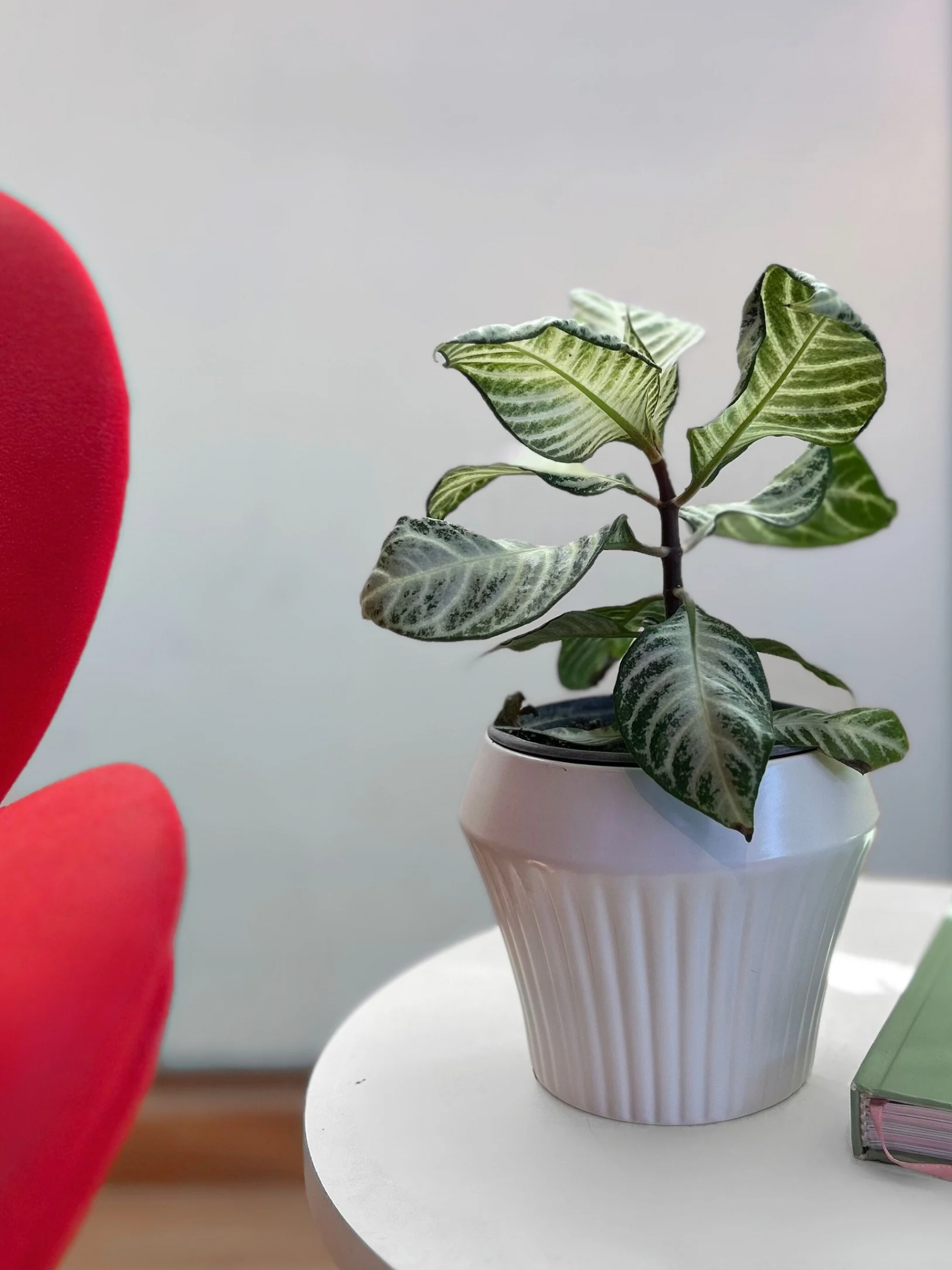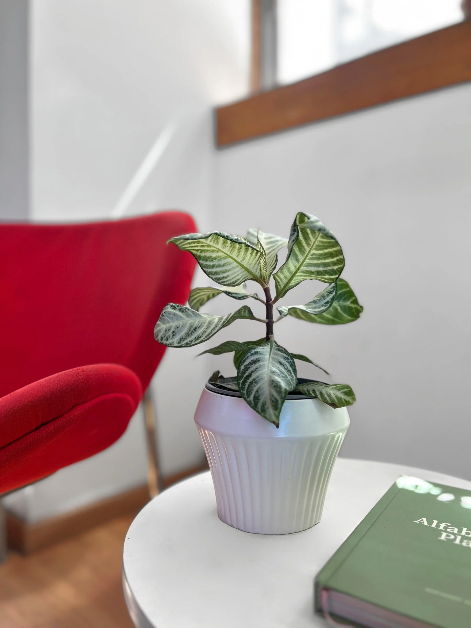 La Aphelandra White Wash destaca por sus crespas grandes, ovaladas y de textura ligeramente coriácea, con un patrón marmolado en tonos verde claro, crema y blanco, que le da un aspecto luminoso. Sus nervaduras marcadas realzan aún más el contraste de colores, convirtiéndola en una verdadera planta protagonista para espacios interiores bien iluminados.