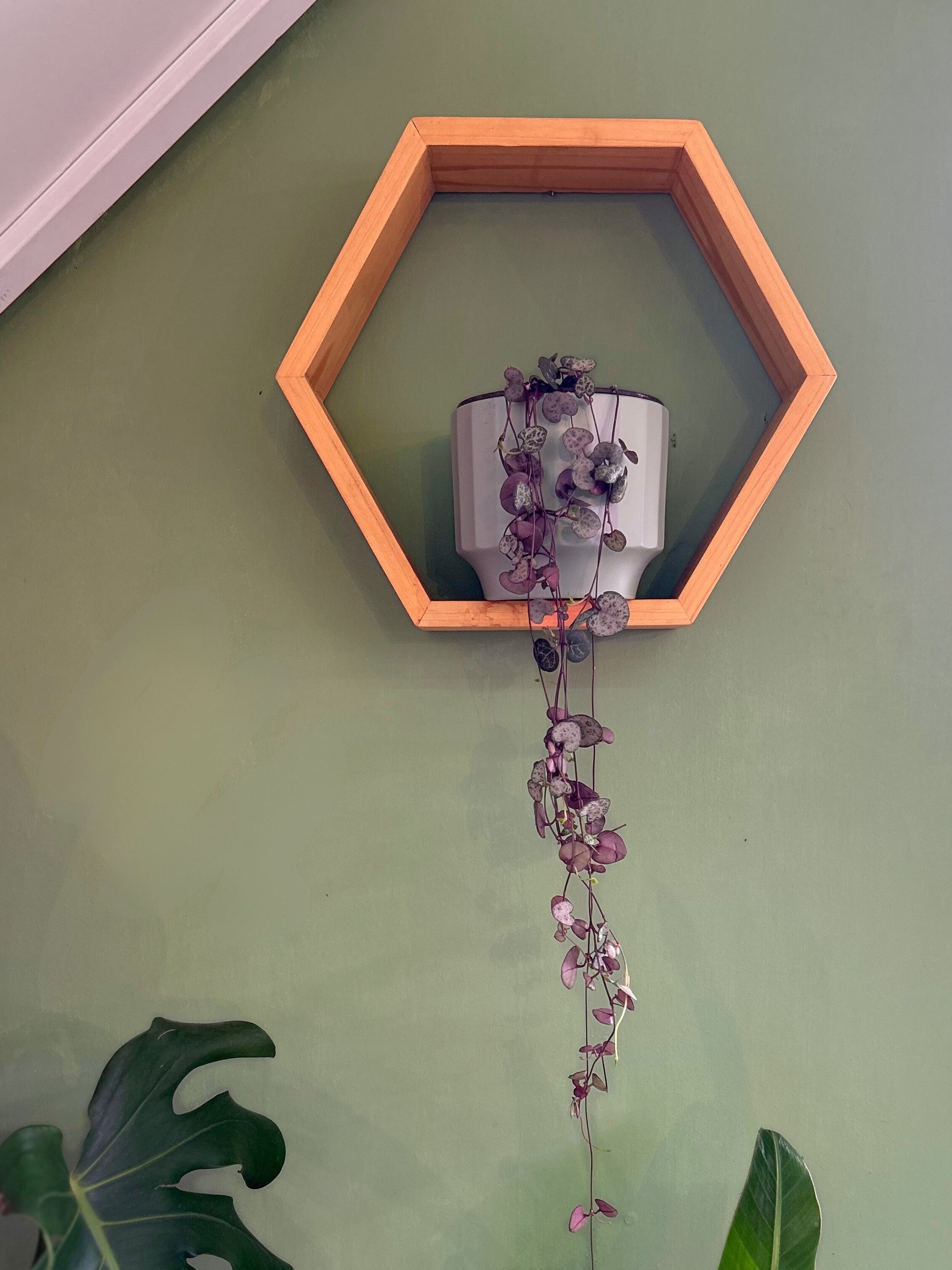 También conocida como collar de corazones o cadena de corazones, su hermoso color verde morado en cada par de corazones que caen de a dos en dos seduce a cualquier amante de las plantas. Es colgante por excelencia, alcanzando metros de altura y creciendo muy frondosa. Luce hermosa sobre repisas o estantes en altura en donde pueda lucir su crecimiento colgante.