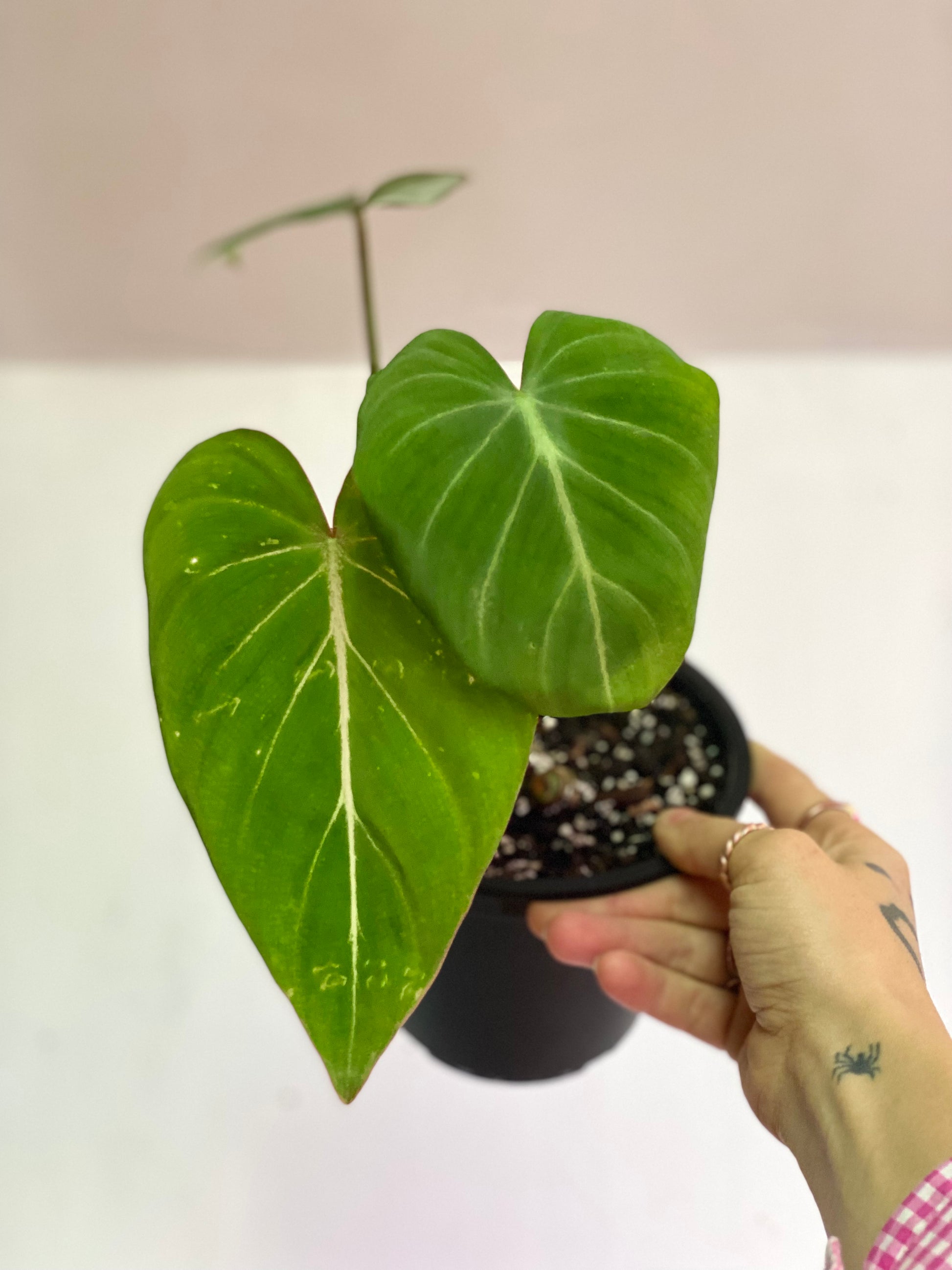 El Filodendro Glorioum es famoso por la belleza de sus hojas. A medida que la planta madura y se aclimata a su entorno, las hojas crecen más grandes y adoptan la clásica forma de corazón profundo con venas prominentes. Su textura es aterciopelada.