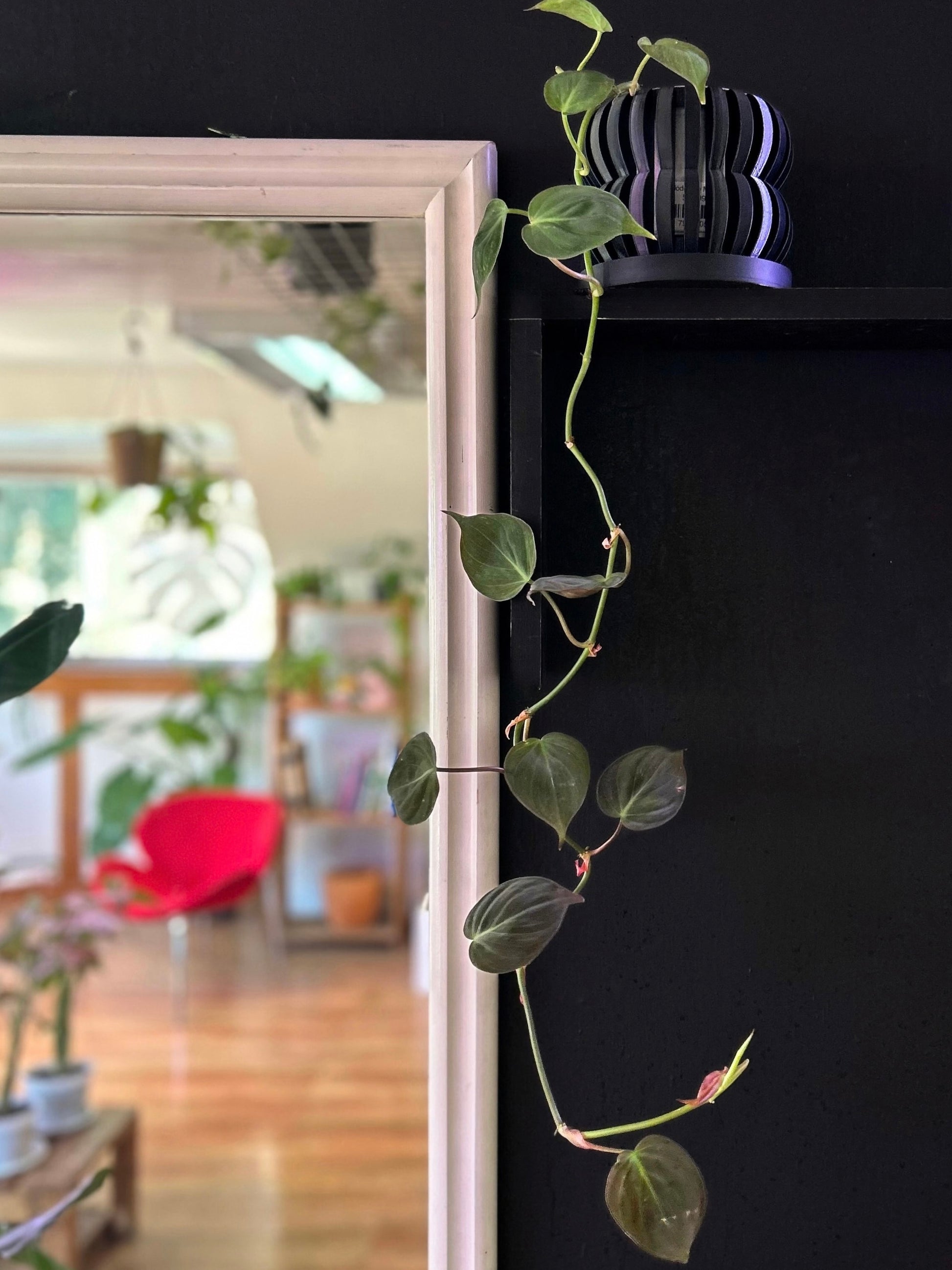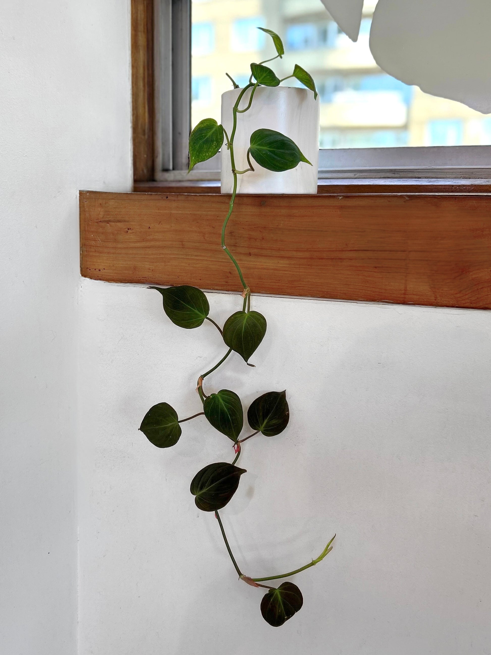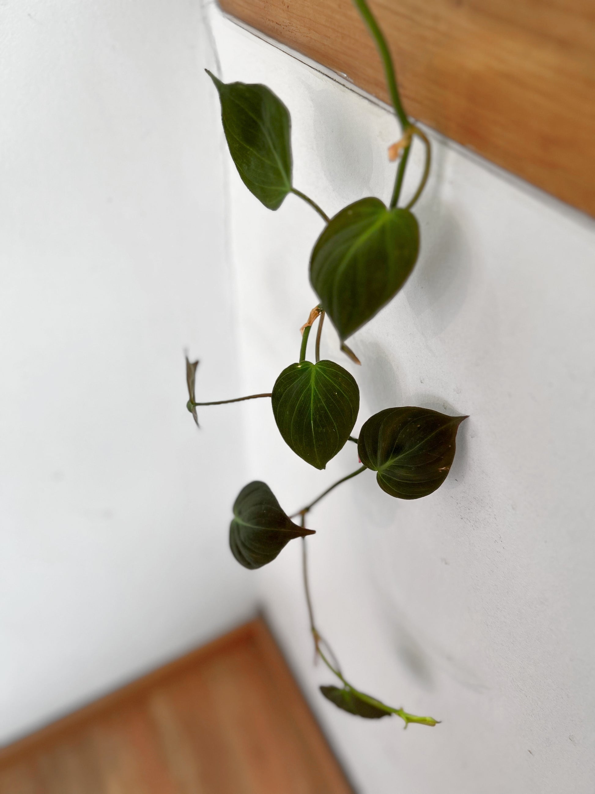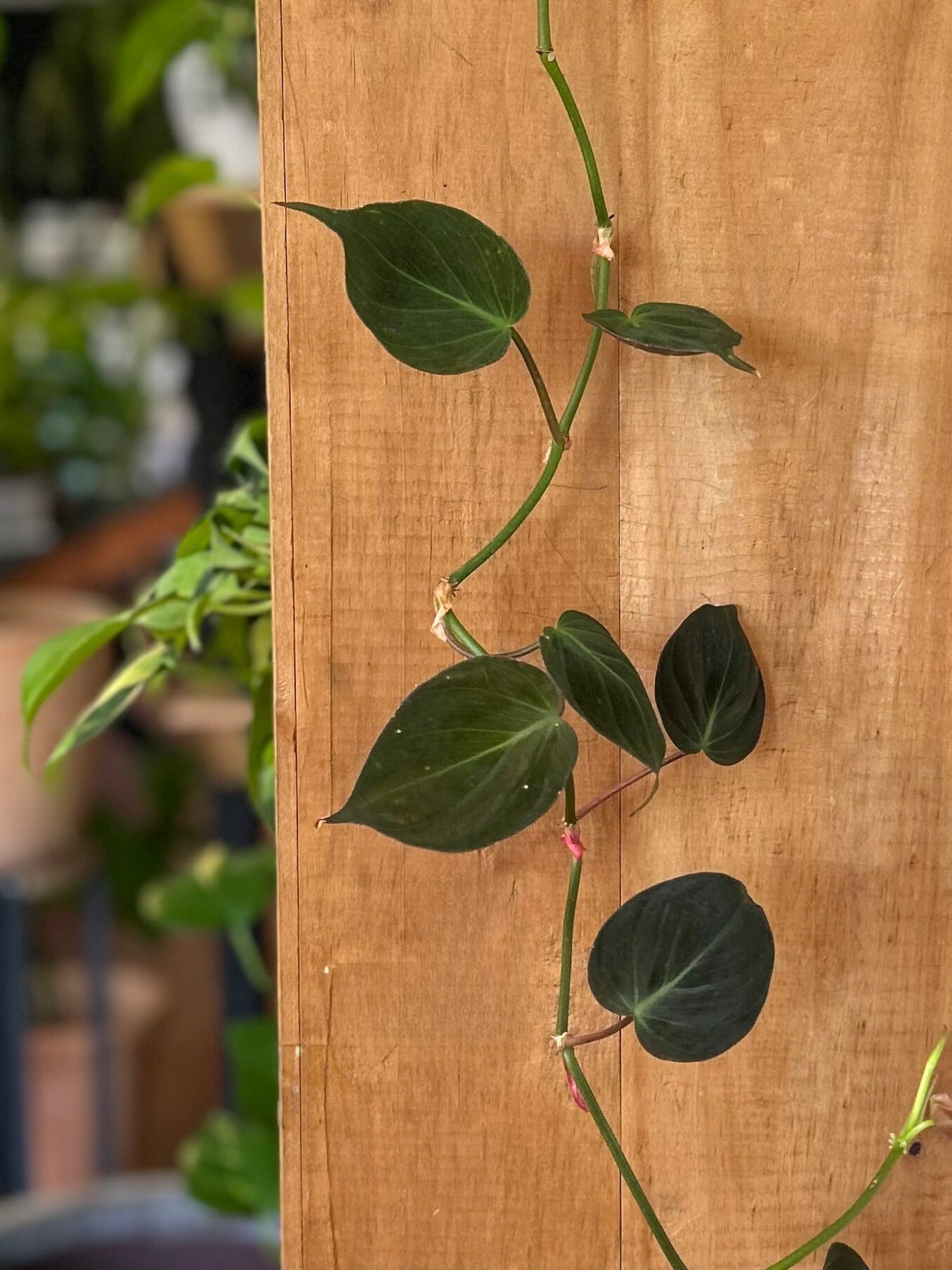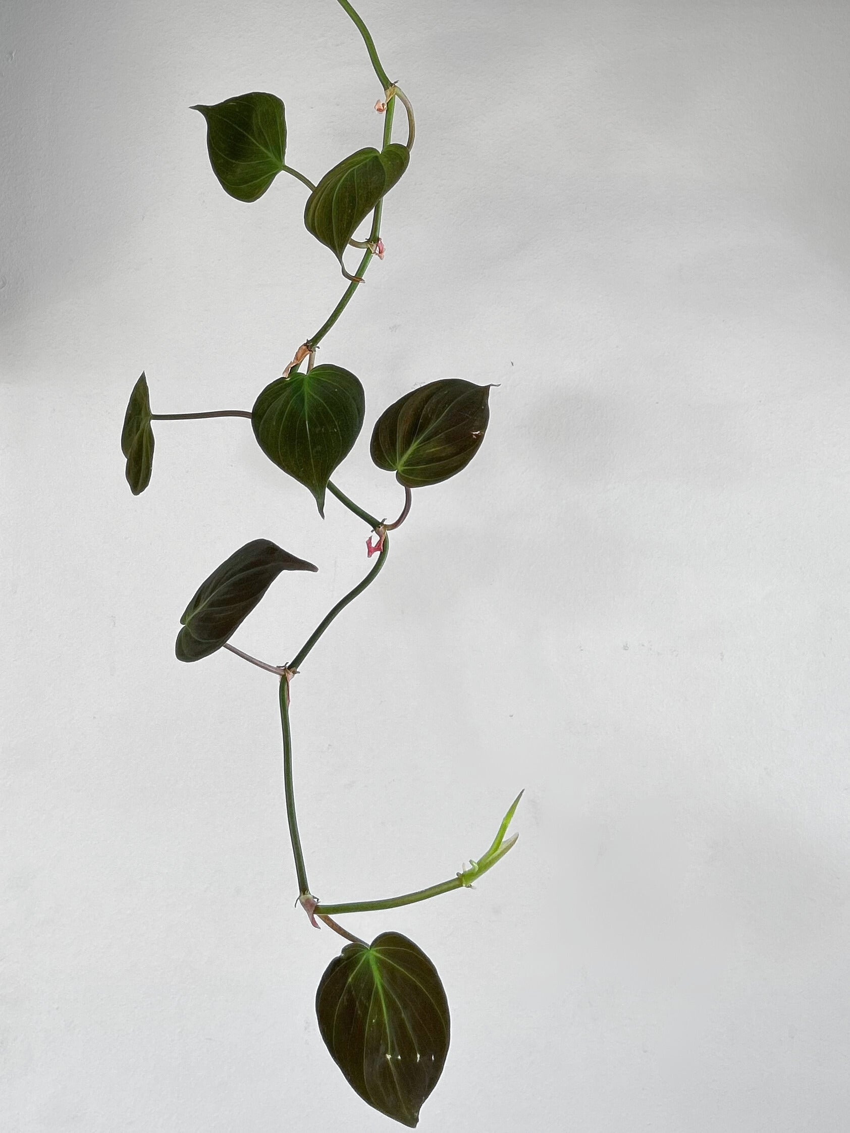El Filodendro Micans es una trepadora de follaje aterciopelado que cambia de tonalidad según la luz. Sus hojas en forma de corazón combinan verdes profundos con reflejos bronce y cobrizos, especialmente notorios en los brotes nuevos. Esa textura suave y su brillo satinado lo diferencian de otros Filodendros colgantes más comunes.
