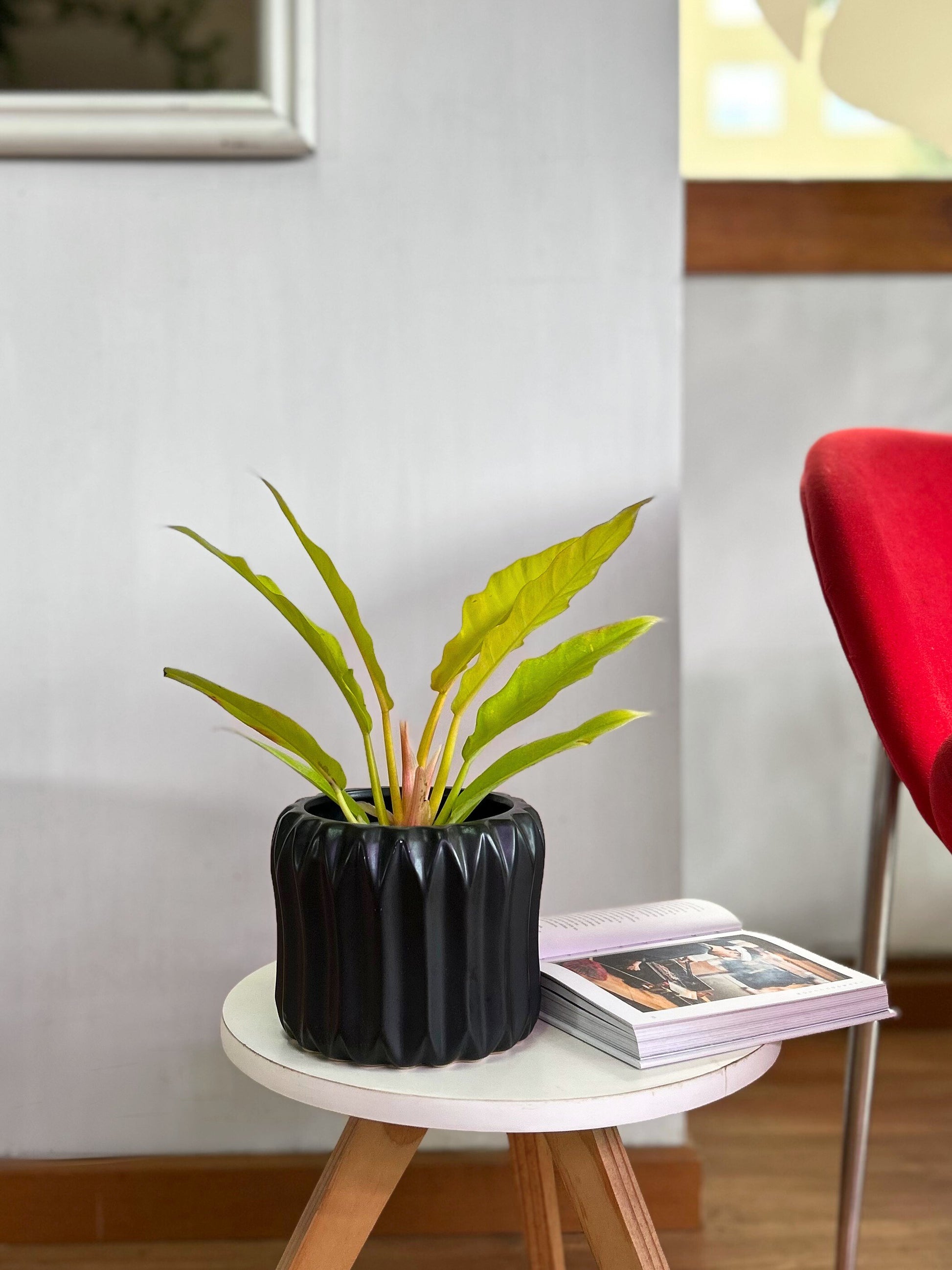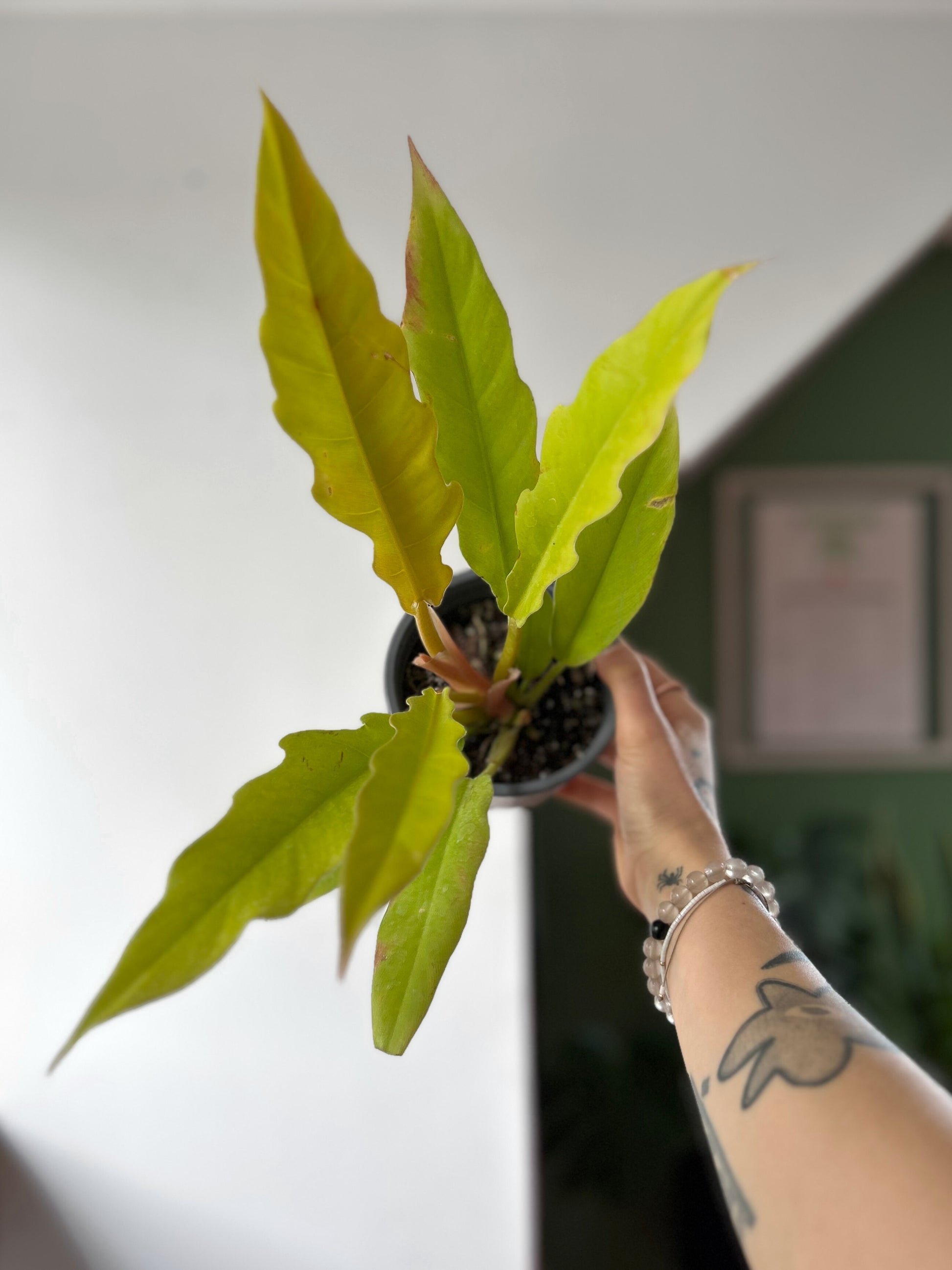 Filodendro único e irrepetible. Sus hojas son grandes, de forma ovalada, terminan en punta y con una coloración única. La parte central de la hoja es de un verde intenso, mientras que los bordes presentan una llamativa combinación de tonos dorados y amarillos, creando un efecto de "anillo de fuego" alrededor de la hoja.