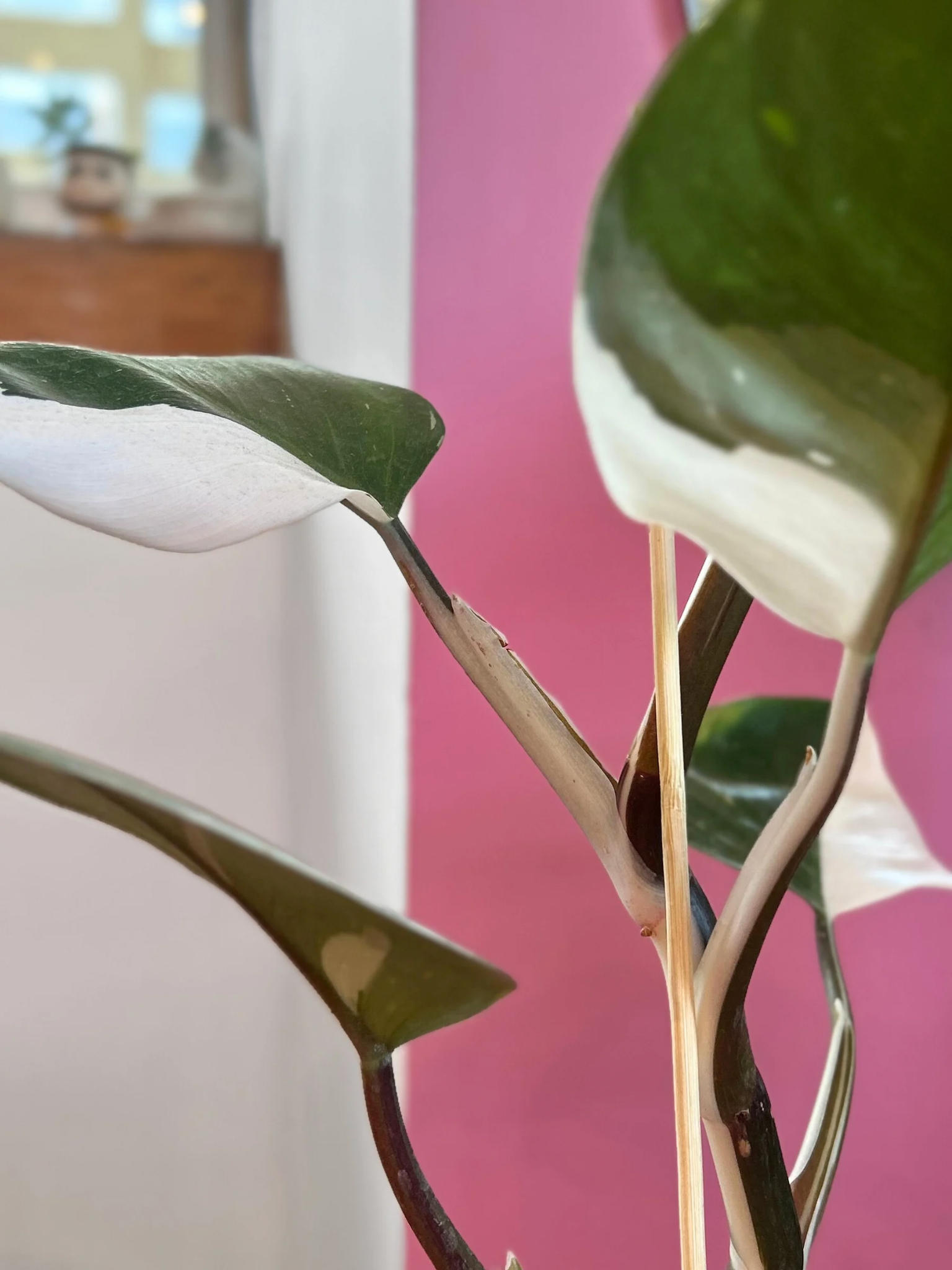 Este Filodendro es un espectáculo, sus tallos marrones, con hojas verde oscuro y tonos blancos dejan a cualquiera embobado y deseando que sea parte de su colección. Habitualmente se confunde con el Filodendro white princess, pero aquel tiene peciolos rosados en sus tallos y hojas más alargadas, mientras que el white knight tiene tallos burdeos y blancos, con hojas mas grandes y menos alargadas, sin embargo su forma de cuidado es la misma.