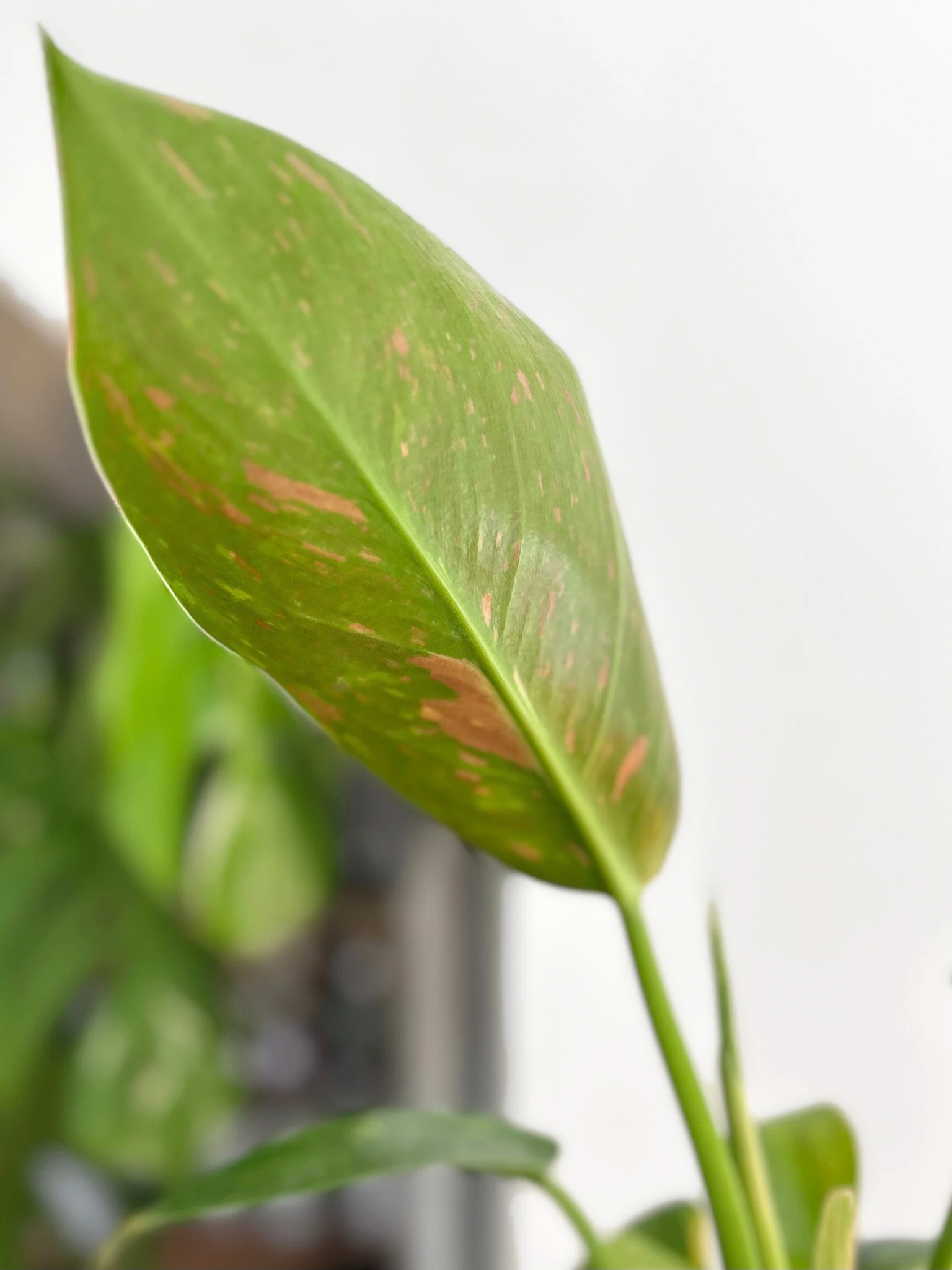 Uno de sus mayores atractivos está en el envés de sus hojas, donde aparecen vetas rosadas intensas que contrastan elegantemente con el verde del haz. Este detalle le aporta un toque ornamental único y sofisticado, especialmente visible cuando las hojas se mueven con la luz o desde ciertos ángulos.