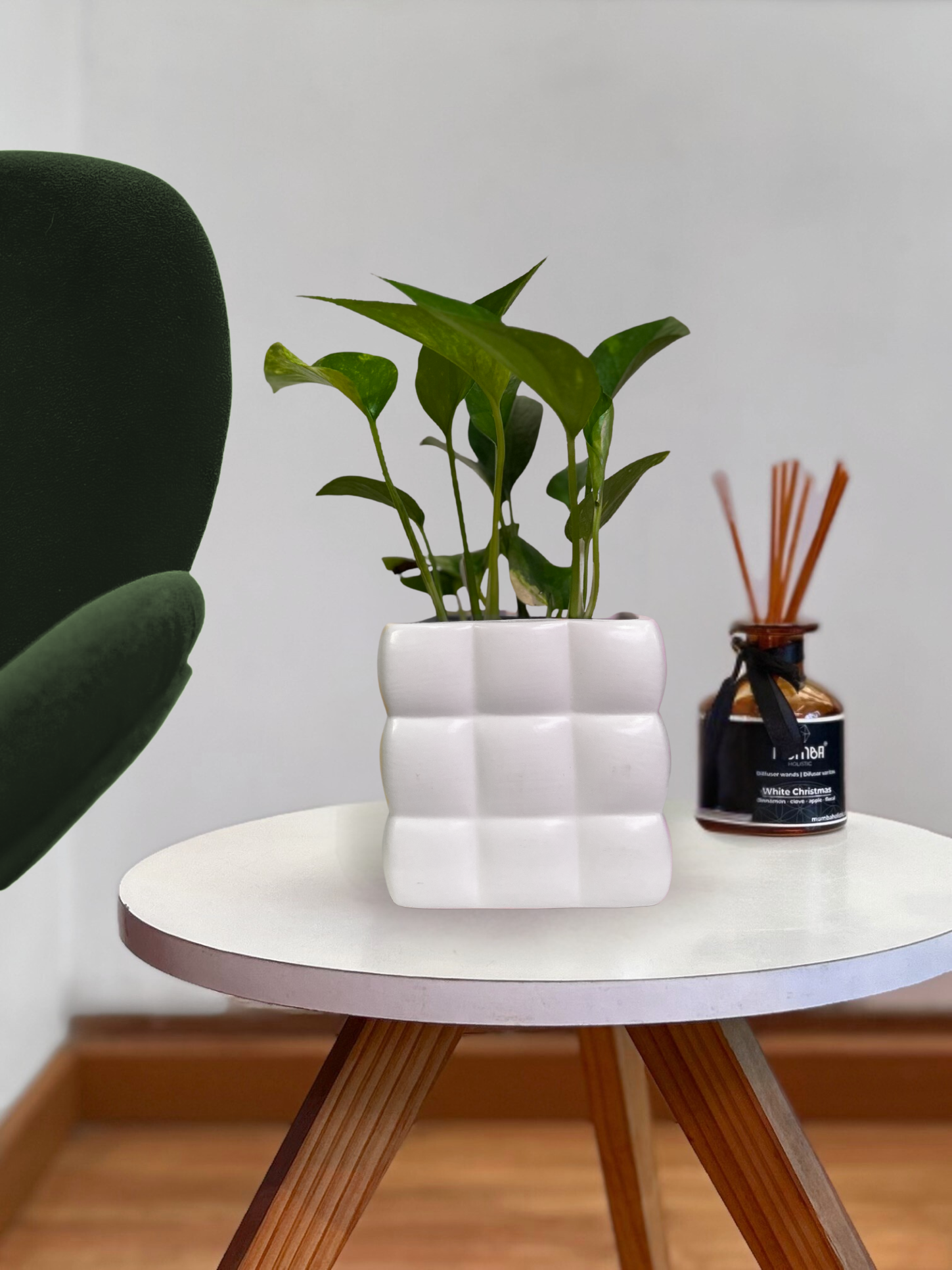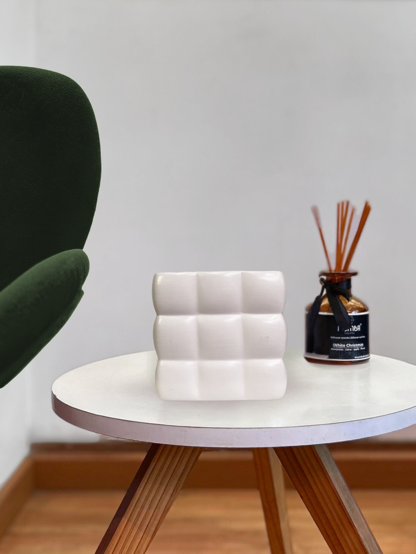 Macetero de cerámica con forma cuadrada y diseño de cuadros. Original y moderna