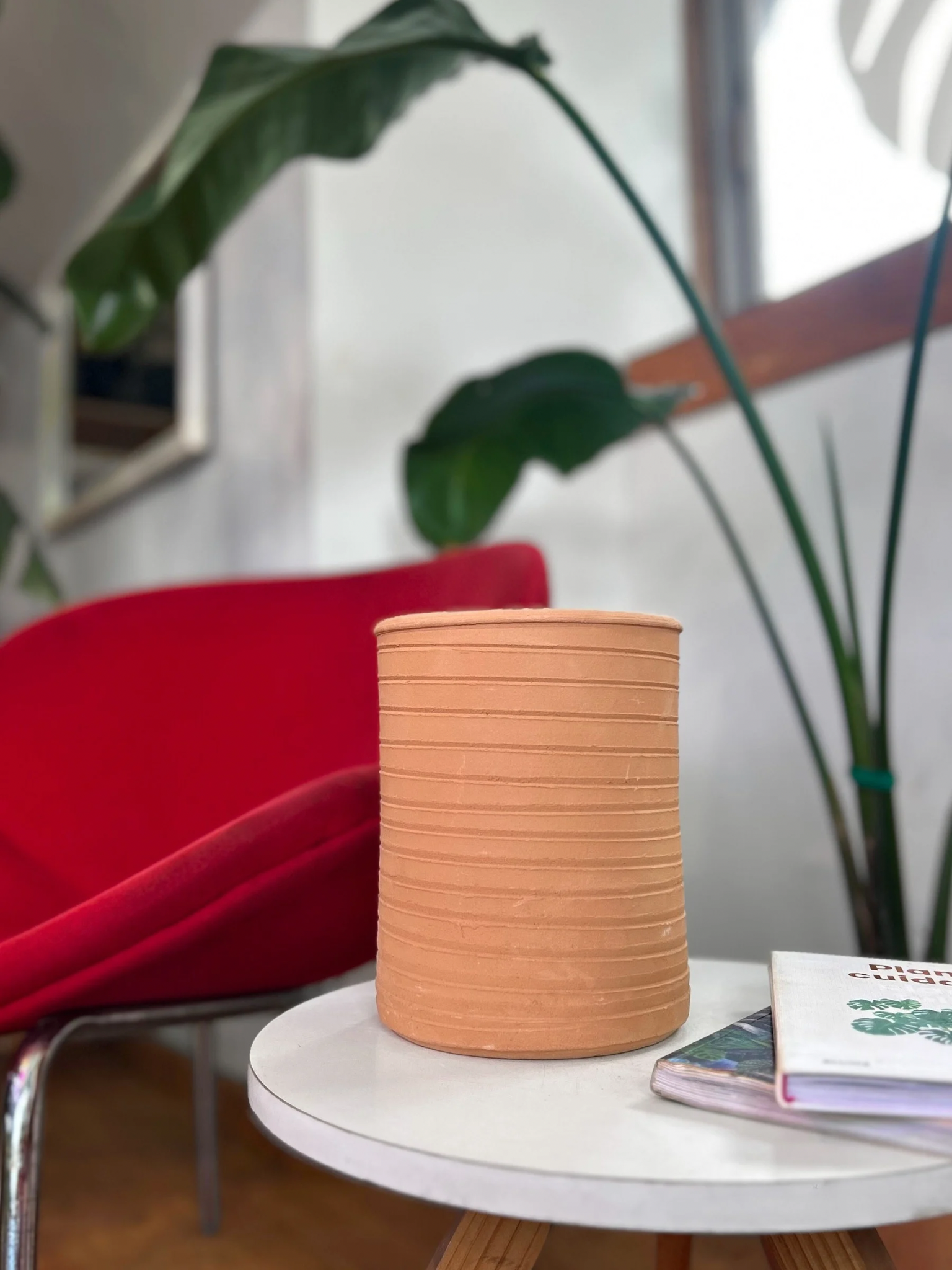 Macetero en diseño tubo en greda natural, que da un aspecto orgánico a tus plantas y decoración