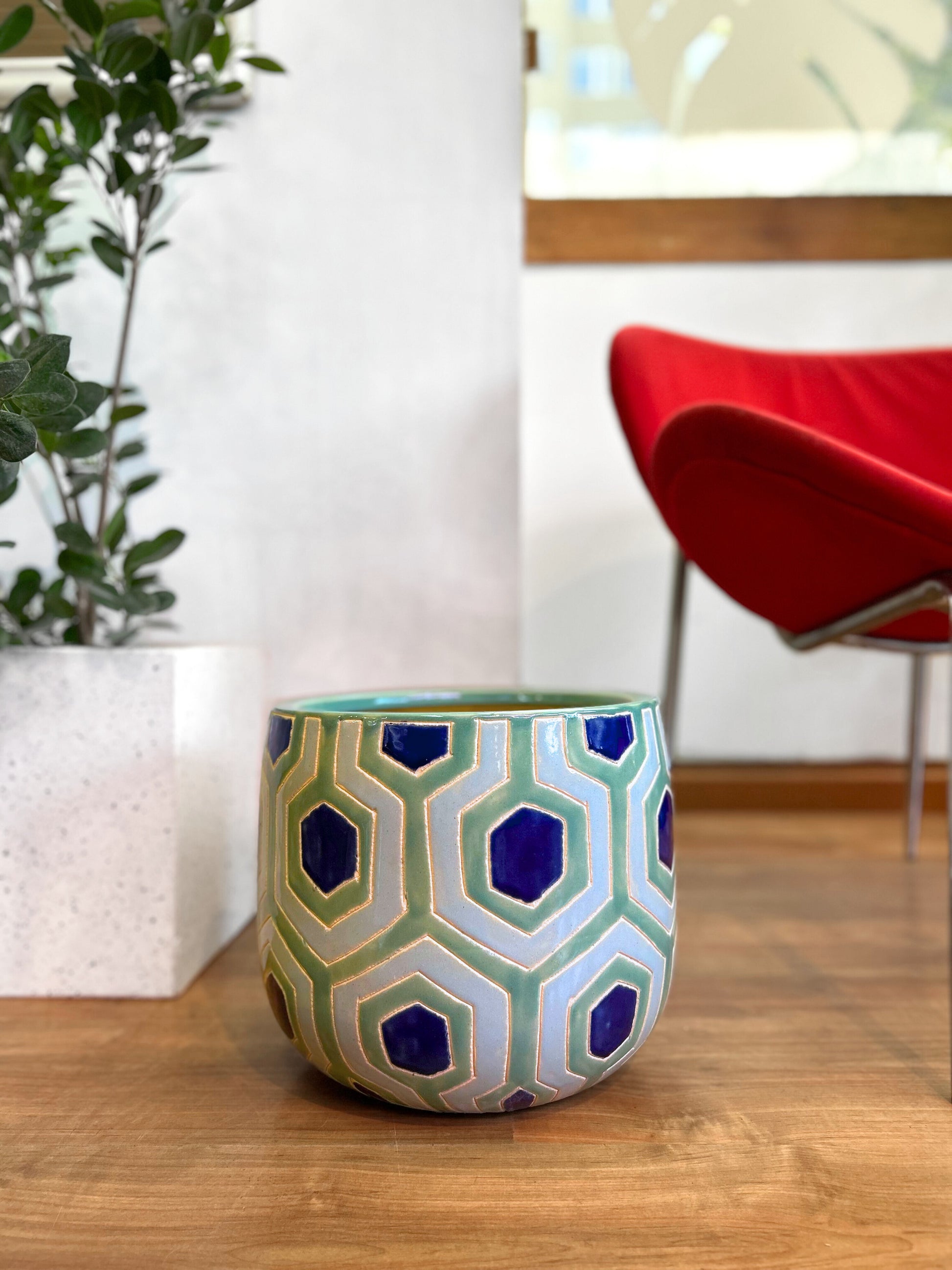 Macetero de cerámica en forma de copa profunda con diseño panal en azul, verde musgo y celeste claro.